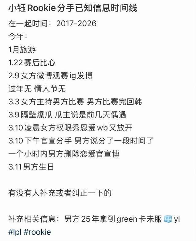 根据网友整理的时间线,这位女网红是在去年12月31日发的国产护手霜的照片,但今年二月份小钰还在微博观看Rookie的比赛,3月3日iG和AL的比赛还被安排主持的排班,两人在这段时间似乎还没有正式分手。有网友看到时间线后认为这都不能用“无缝衔接”来解释,有网友评论表示:“小钰太惨了。”