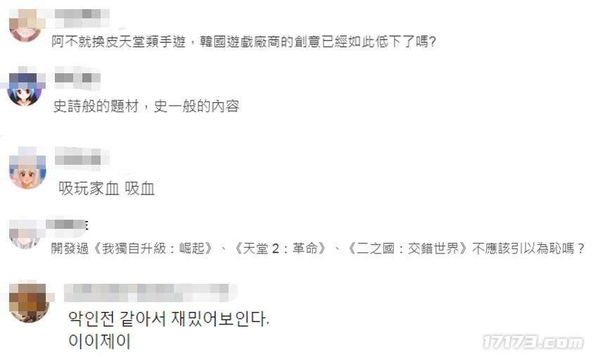 有玩家就感慨,这不就是类似《天堂》的换皮手游?现在韩国游戏厂商就这么没创意了?有网友就吐槽,史诗般的题材,“史”一样的内容。更有网友直言这是游戏在吸玩家的血。还有网友表示,研发过《我独自升级:崛起》《天堂2:革命》《二之国:交错世界》不应该引以为耻吗?
