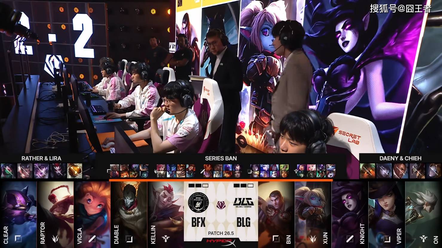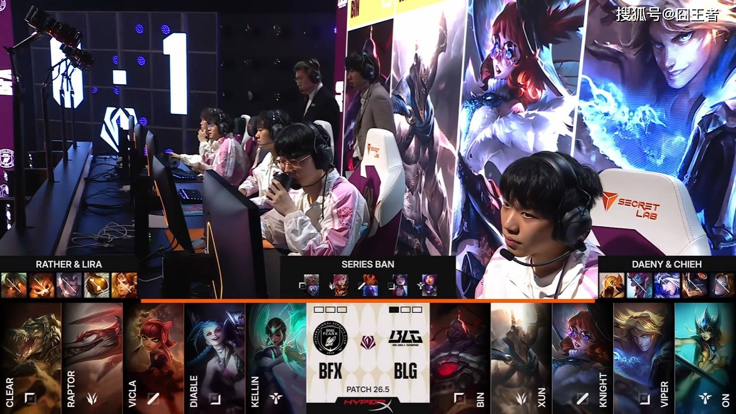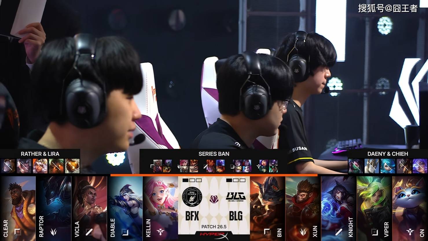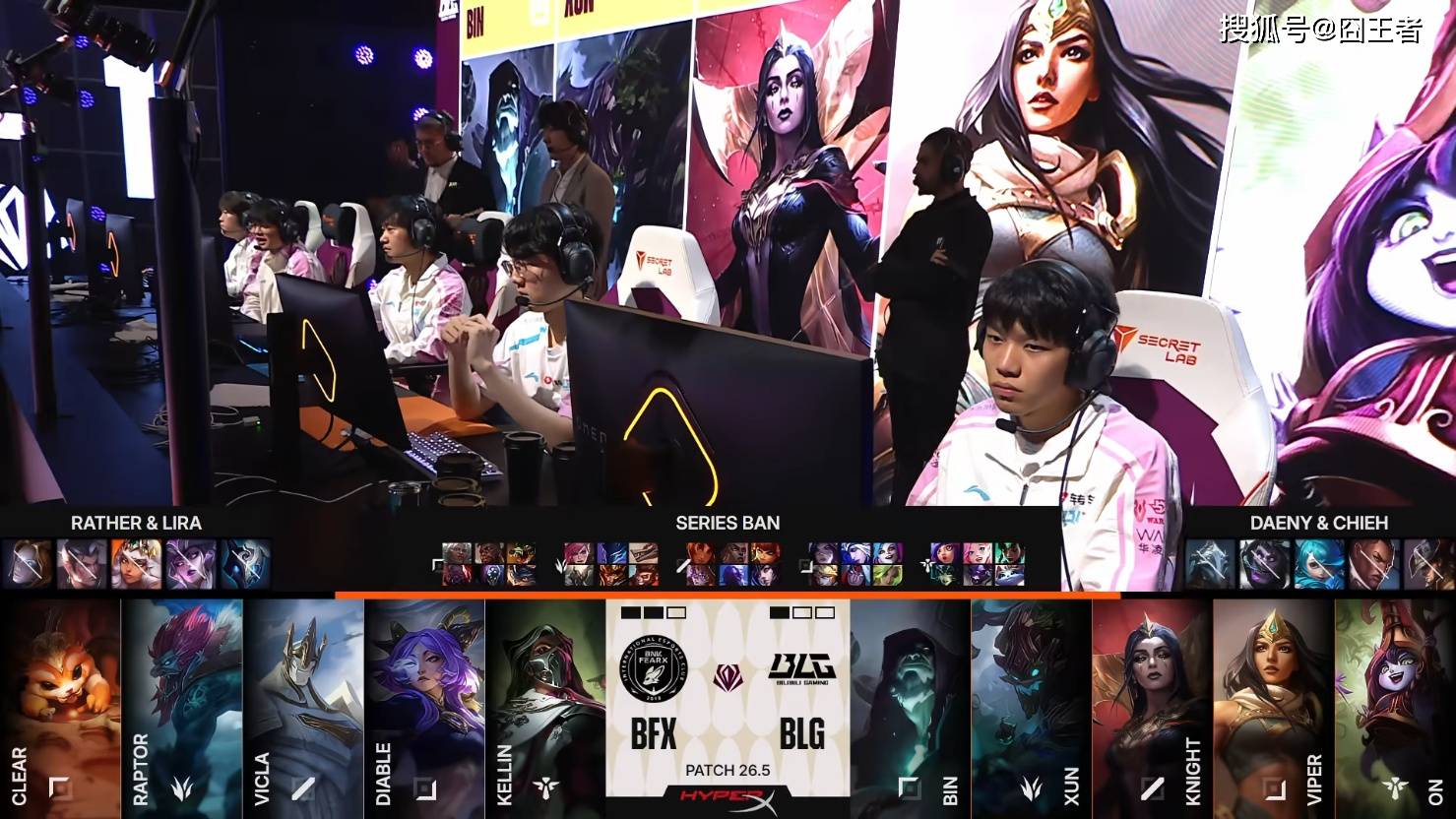 第一局比赛,BFX蓝色方,禁用:鳄鱼、巴德、赵信、波比、发条,选用:Clear安蓓萨、Raptor蔚、VicLa岩雀、Diable卡莎、Kellin妮蔻;BLG红色方,禁用:沙皇、卡尔玛、兰博、伊泽瑞尔、芸阿娜,选用:Bin贾克斯、Xun皇子、knight瑞兹、Viper韦鲁斯、ON牛头