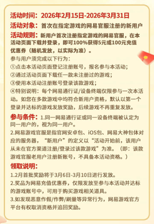 不仅邀请人可以爽吃拉新奖励,被邀请的新用户也能爽吃一波福利,只要新用户首次注册指定游戏的网易官服,前往活动页面下载并登陆就能100%获得5r或是100r的充值优惠券!如果你有想拉朋友入坑你主推的游戏可以趁现在猛猛开冲~