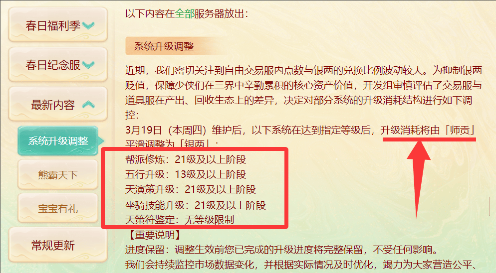 在3月19日本周四维护后,交易服将会迎来重大变革,之前用师贡提升实力的帮派修炼、五行、天演策、坐骑技能、天策符鉴定,一律将平滑调整为消耗银两升级。