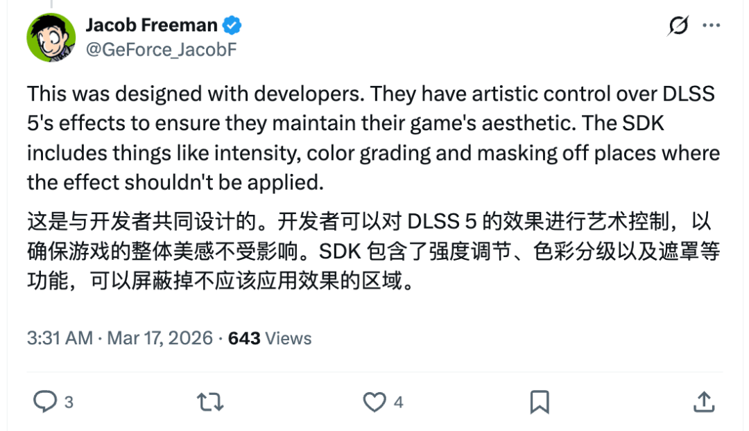 英伟达的布道师雅各布·弗里曼也出来强调,开发者“ 可以对 DLSS 5 的效果进行艺术控制,以确保游戏的视觉美感不受影响”。