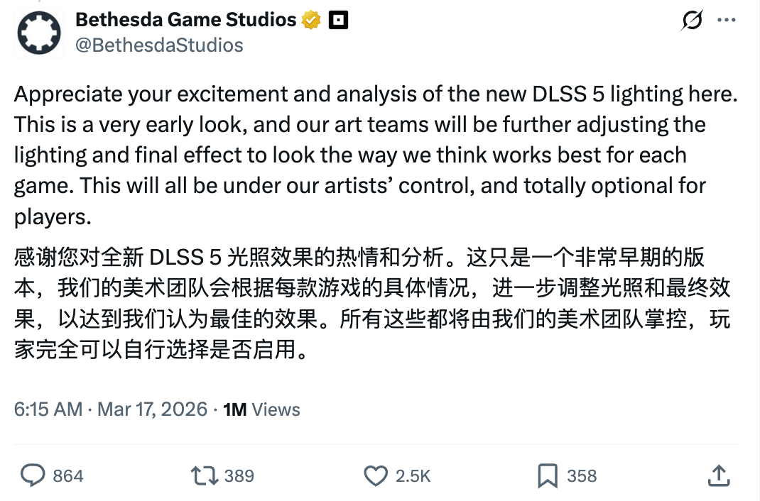 贝塞斯达则在评论区表示,即将登陆《星空》和《上古卷轴 4:湮没》重制版的DLSS 5支持 完全由其美术人员掌控