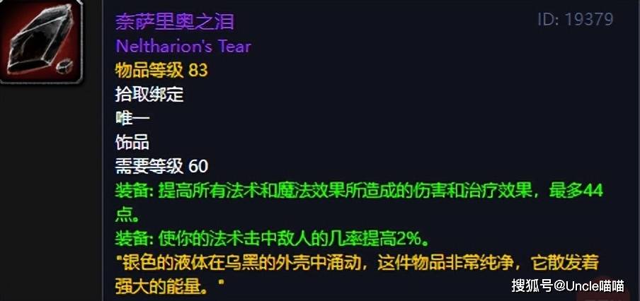 黑翼之巢奈法利安掉落的奈萨里奥之泪,是60年代法系职业的“毕业证明”。44点常驻法伤+2%法术命中,让它在TBC初期依然能与牌子饰品掰手腕,实力绝对恐怖如斯直戳天花板,在装备迭代极快的魔兽里,能横跨两个版本的饰品屈指可数,而奈萨里奥之泪就是其中的代表之一。