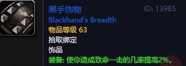 通过黑上通关任务获得的黑手饰物,是60年代近战职业的“入门神器”。2%的致命一击提高,搭配正义之手,成为了团本前的完美组合。当然喵叔也是耳闻“戴上它就会变黑手,ROLL装备永远点最低”,不知真假!