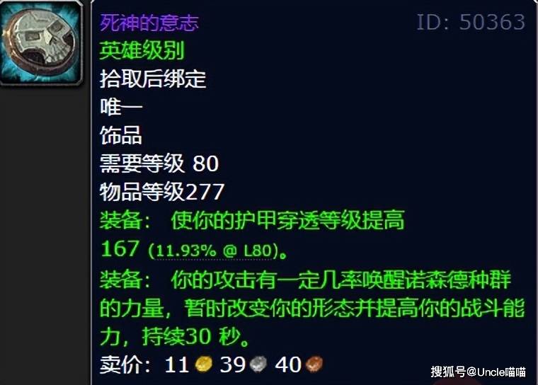 冰冠堡垒25人英雄模式萨鲁法尔掉落的死神的意志,是整个魔兽历史上最具标志性的饰品之一。它不仅提供超高的常驻破甲,触发后还能改变人物模型,带来30秒的超模属性提升。怀旧服中,它的价格经常高达几十万金币,甚至出现20个打工仔和5个老板抢着加价的盛况。它的“变形特效”更是成为了魔兽史上最经典的设计之一。