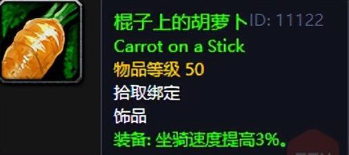 这根插在棍子上的胡萝卜,是60年代最具代表性的“功能性饰品”。它没有任何战斗属性,唯一的特效是让你奔跑时身后扬起尘土,座下的小马驹跑的更加欢快。在那个没有飞行坐骑、跑图全靠双腿的年代,它不仅是速度与激情的象征,那根胡萝卜承载的更是我们对艾泽拉斯最初的探索欲。