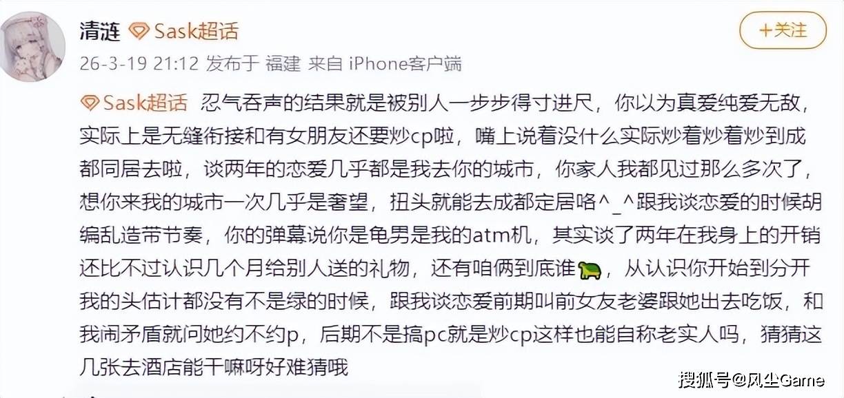刚官宣半个月,前女友就跳出来开锤,看来Sask的私生活,也是有点混乱啊,被开团之后,Sask在直播间回应:私事就是私事,没必要直播说,契机到了,自己会在社交媒体公布,连回应的勇气都没有,难道崩哥真有问题?不过这些都是单方面爆料,还没锤到死,咱们也不能妄下判断。