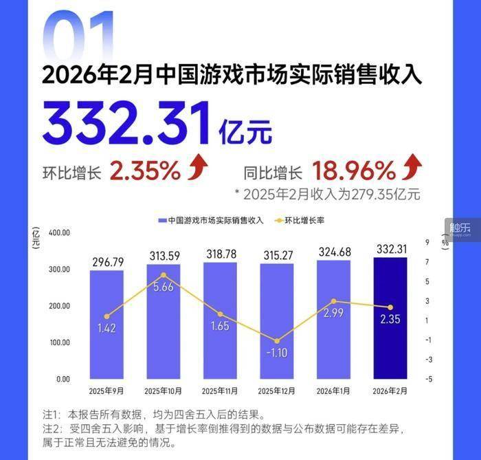 报告显示,2026年2月,中国国内游戏市场实际销售收入为332.31亿元,环比增长2.35%,同比增长18.96%。其中,中国移动游戏市场实际销售收入227.29亿元,环比增长0.48%,同比增长9.05%;中国客户端游戏市场实际销售收入88.70亿元,环比增长7.70%,同比增长56.75%。中国自主研发游戏海外市场实际销售收入21.14亿美元,环比增长1.77%,同比增长40.46%。