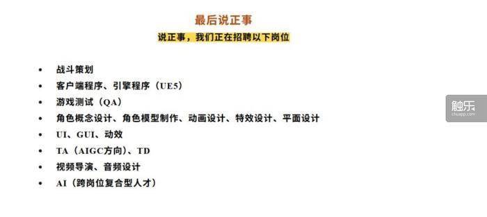 从公开发布的招聘信息来看,芥子游戏对战斗策划、“虚幻5”引擎程序、游戏测试、角色概念设计、特效设计、平面设计等多个岗位均有需求。同时,如TA(AIGC方向)、跨岗位能力的复合型AI人才等AI相关岗位,也是重点招募对象。