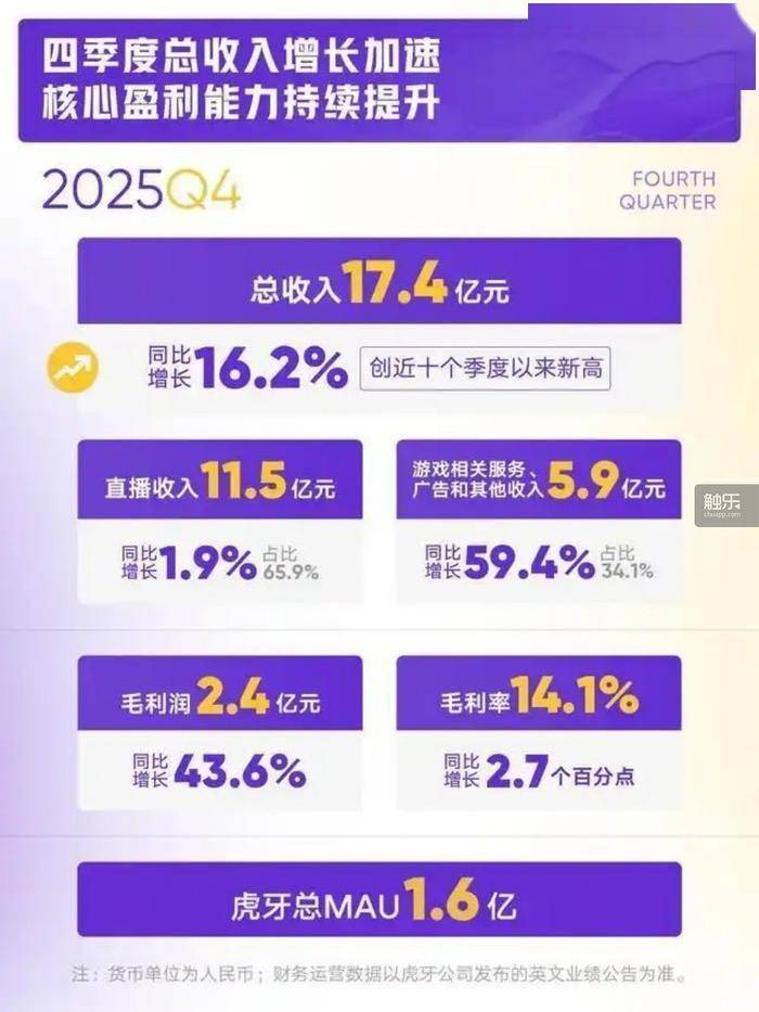 3月17日下午,虎牙公司公布了2025年第4季度及全年财报。财报显示,2025年第4季度,虎牙总收入为17.4亿元,创近10个季度新高。全年来看,虎牙公司总收入65.0亿元,同比增长7%。