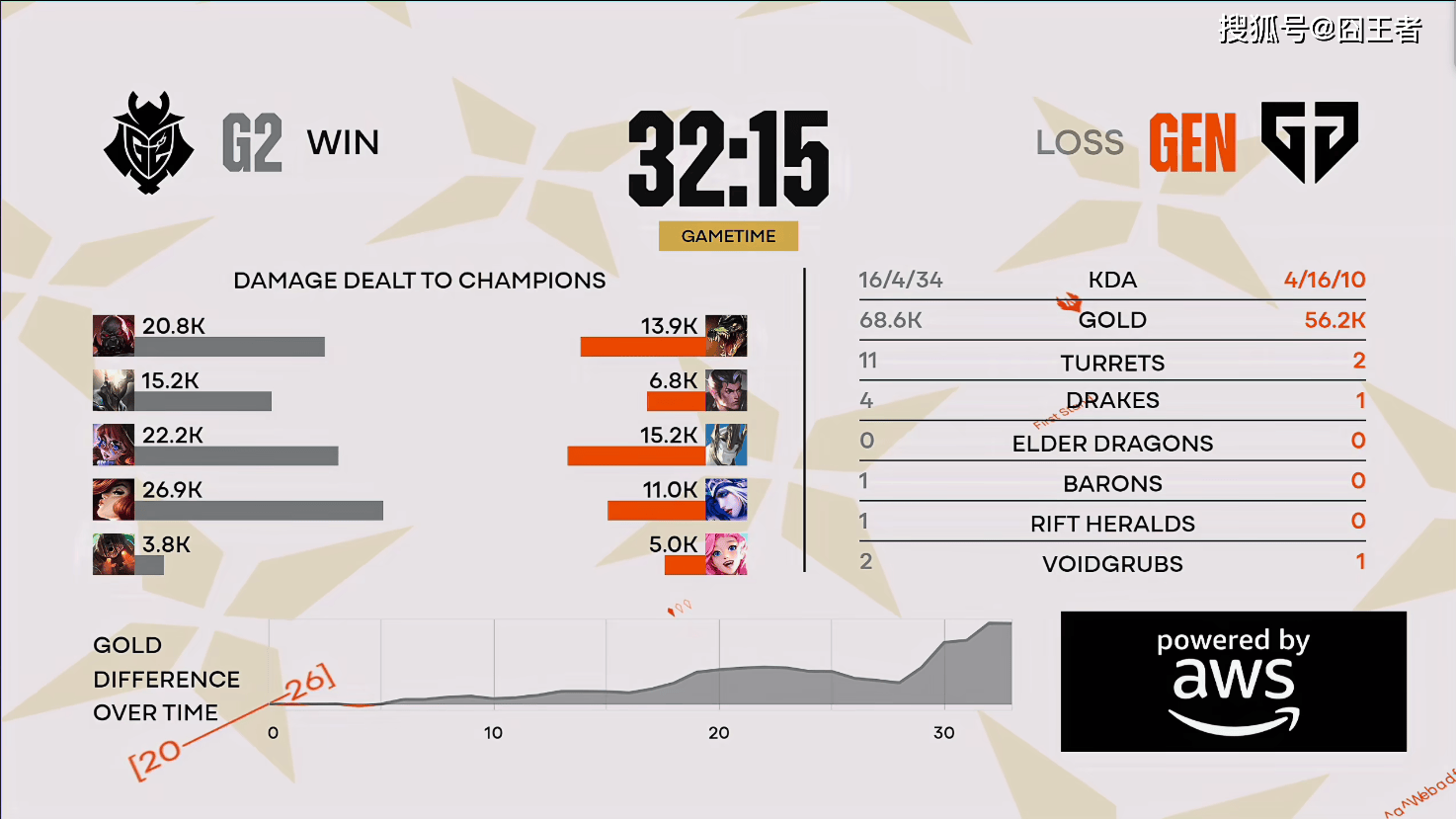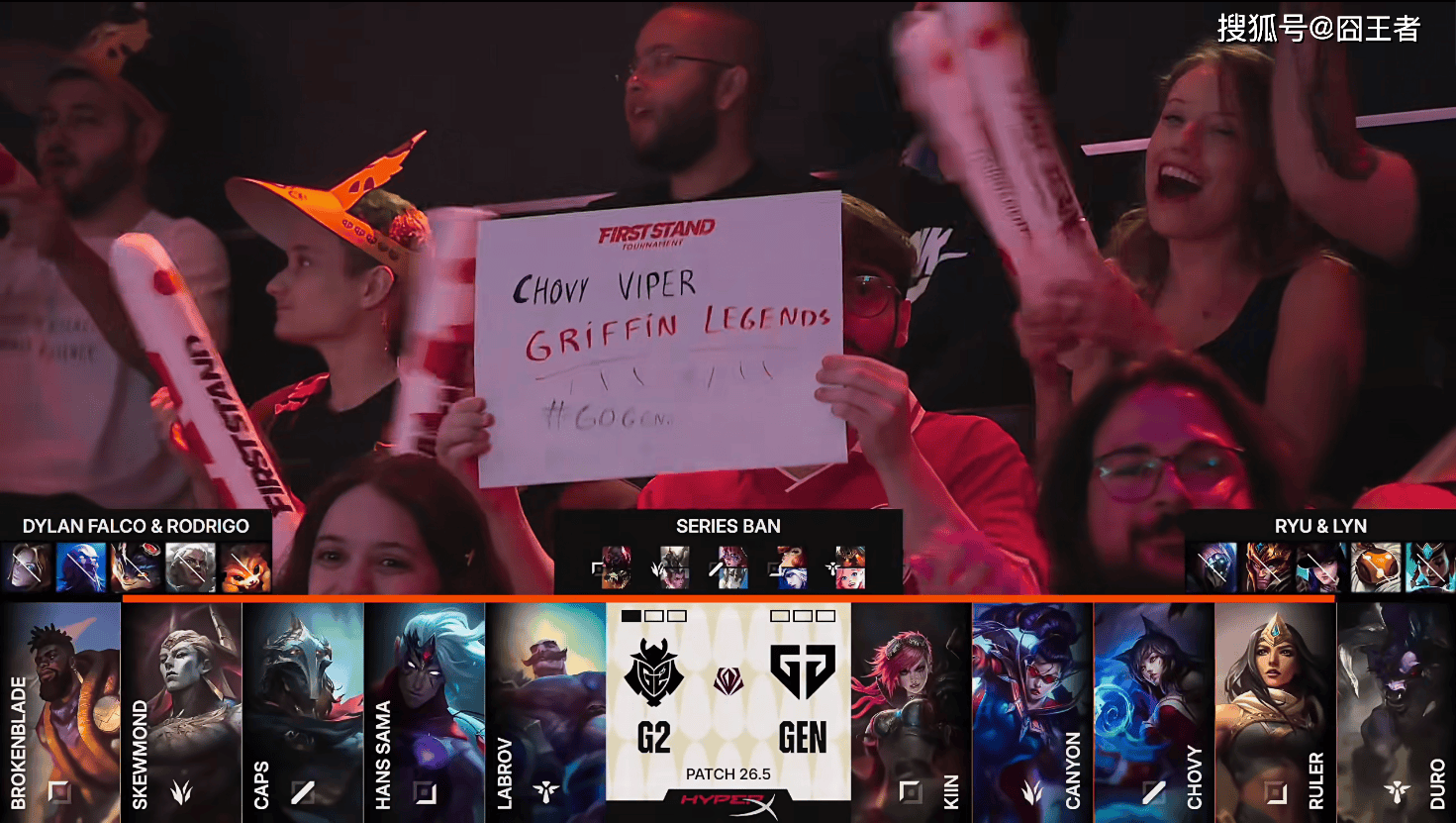 结果第二局比赛,G2是2026年以来唯一一支赢下GEN两个小场的队伍。4分钟左右,Hans Sama果断闪现躲掉牛头WQ二连,G2下路完成线杀;6分钟左右,G2三人果断越塔,Labrov极限点燃烫死Ruler;19分钟左右,G2众人控制链拉满强行击杀Kiin,G2团战完成0换2;22分钟左右,Kiin薇恩强行往塔下撤退遭到击杀,GEN野辅支援同样被杀;23分钟左右,G2率先拿下大龙,GEN趁机拿下听牌龙随后Canyon被击杀;24分钟左右,Kiin再次被秒Labrov开出完美大招,G2团战再次大胜;最终32分15秒,Duro牛头完美绕后GEN打赢巨大劣势团战后,G2随后复活后,团灭GEN,在赢一局,手握三个赛点。