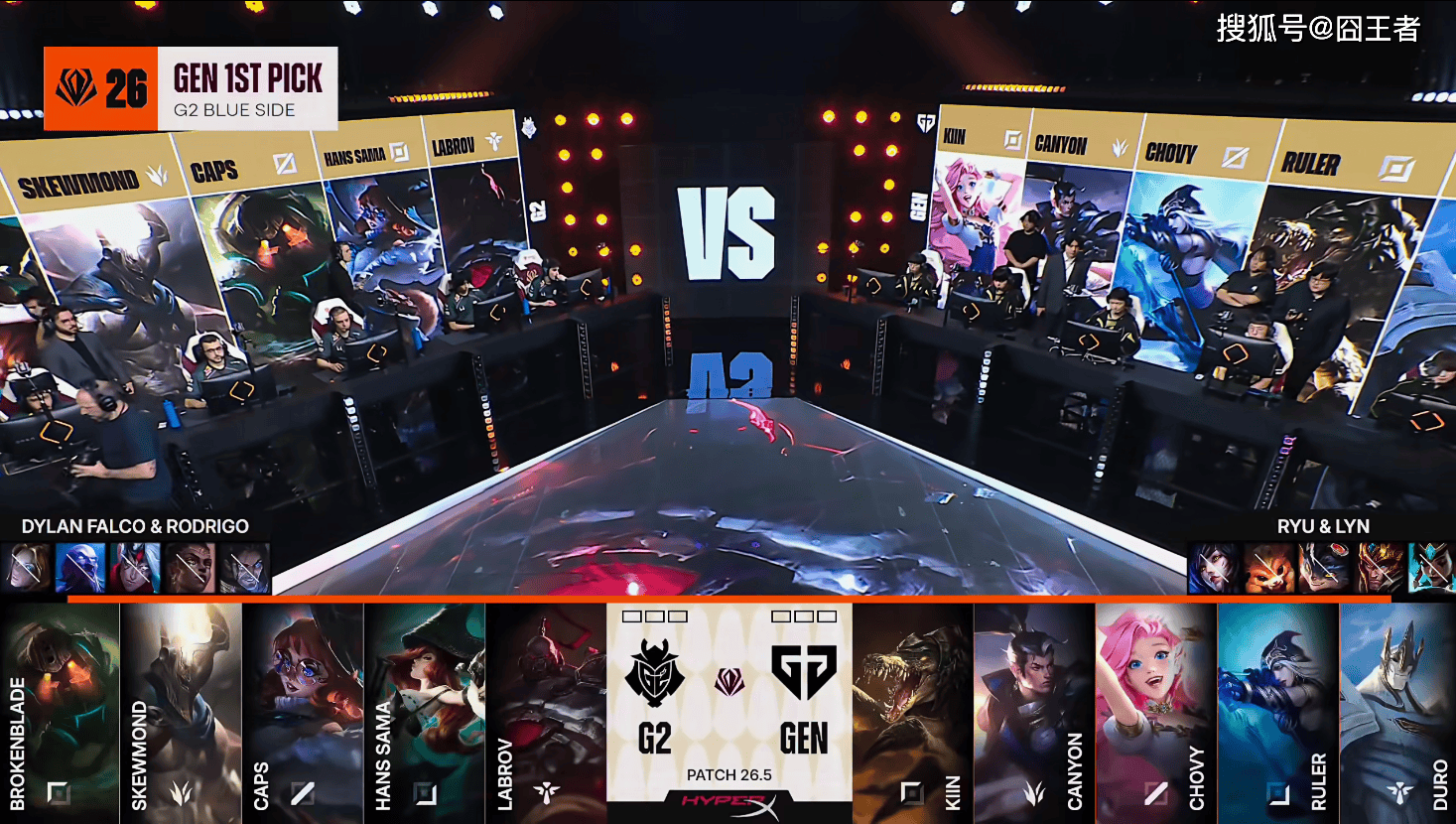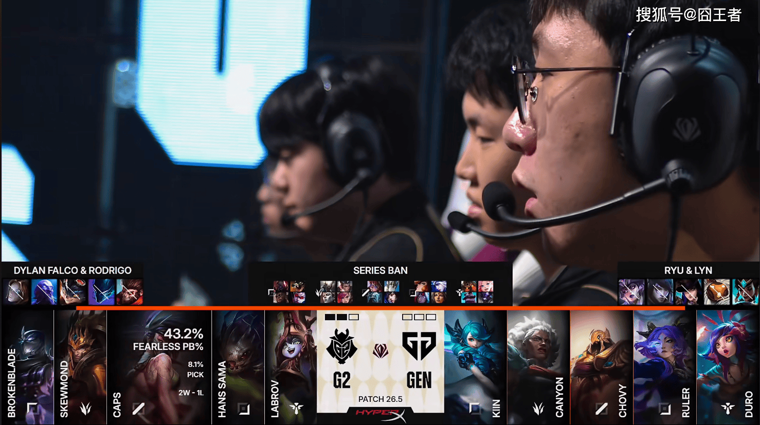 第一局比赛,G2蓝色方,禁用:发条;瑞兹;韦鲁斯;梅尔;塞拉斯,选用:BrokenBlade塞恩;SkewMond潘森;Caps阿萝拉;Hans Sama女枪;Labrov泰坦;GEN红色方,禁用:卡尔玛;皇子;兰博;纳尔;阿狸,选用:kiin鳄鱼;Canyon赵信;Chovy加里奥;Ruler寒冰;Duro萨勒芬妮