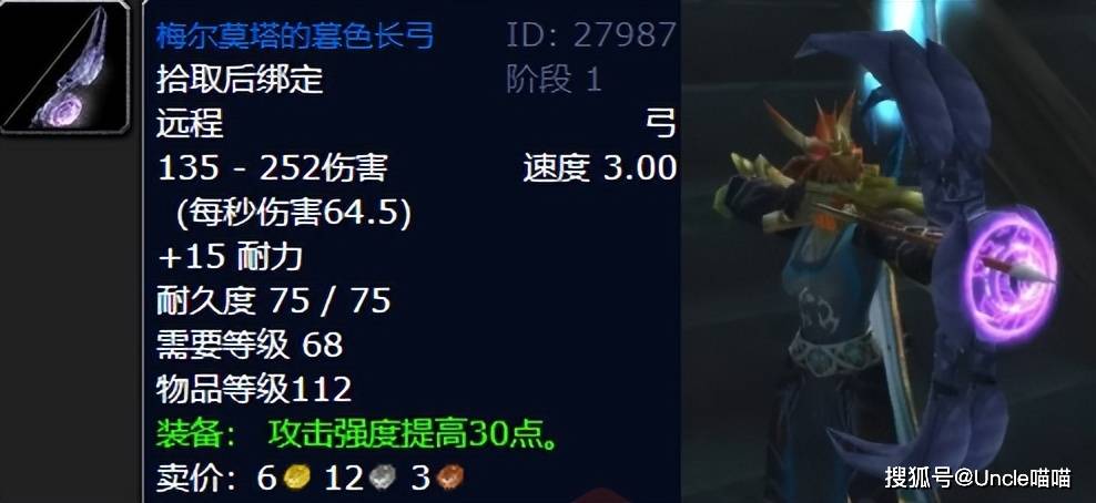 他是TBC版本中一把充满情怀的弓。它与风暴要塞王子武器库中灵弦长弓是同款造型,这让许多猎人玩家为了它,后期一头扎进黑色沼泽,只为邂逅这把充满回忆的武器。弓身散发着淡淡的暮色光芒,仿佛将人带入了一个神秘的魔法世界。虽然它的属性或许不是恐怖如斯直戳天花板的,但那份独特的造型和背后的故事,让它成为了许多猎人玩家收藏列表中的必备之物。