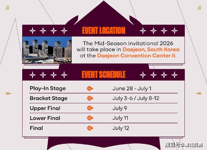 年中的MSI季中赛举办地早前已经确定在韩国大田,近期更一步的消息显示,赛事将在大田会展中心举行,预计可容纳8000人。这也是英雄联盟电竞赛事首次在大田举办。比赛的时间安排上,如下: