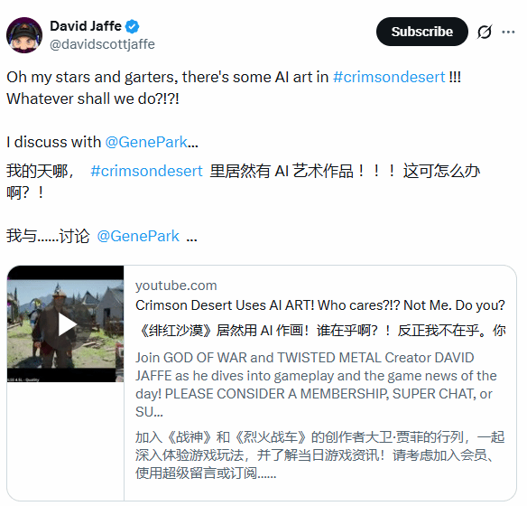 初代《战神》创意总监David Jaffe也发表了类似看法。他在个人YouTube视频中表示,并不在意游戏中夹杂的AI画作,甚至言辞颇为激烈地嘲讽了对此表达不满的弹幕。
