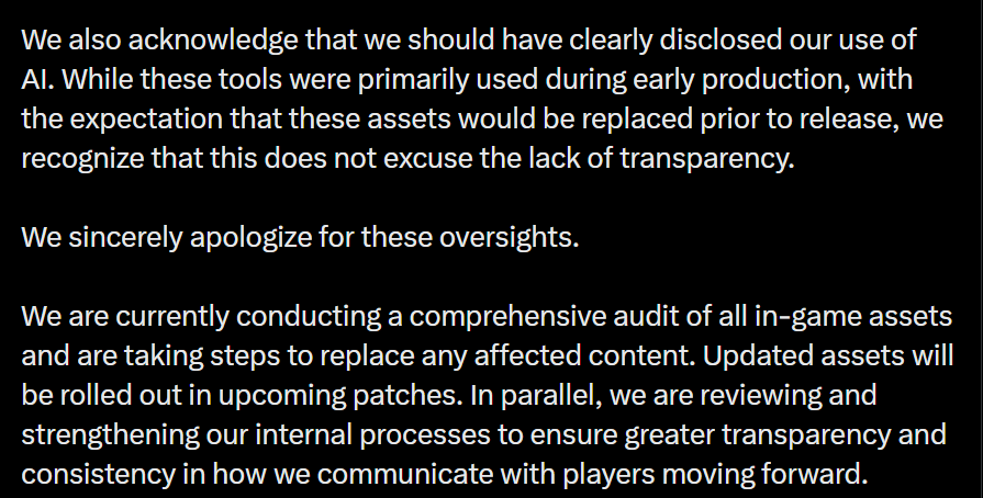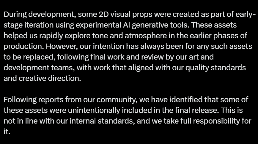 不过,昨天《红色沙漠》官方还是在推特发布了一篇长文,回应了关于使用AI生成素材的争议。官方表示,这些AI美术之所以出现在正式版中,属于流程上的失误。