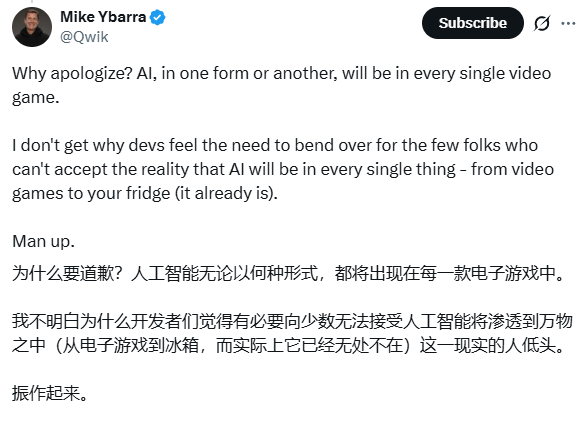 不少玩家对此表达了强烈不满,但也有声音选择站在开发者一侧。比如前暴雪总裁Mike Ybarra,专门发布了一篇推文为Pearl Abyss辩护,称AI终将以各种形式进入每一款游戏,开发者不应在舆论压力下“低头道歉”。