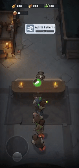 玩家进入《Last Asylum: Plague》就将化身为鸟嘴医生,需要通过滑动屏幕控制角色移动,亲自完成接诊、诊断、配药、治疗、收费等全流程操作,获取金币后用于扩建病房、雇佣护士,逐步实现医院自动化运营,并解锁更多区域与功能。