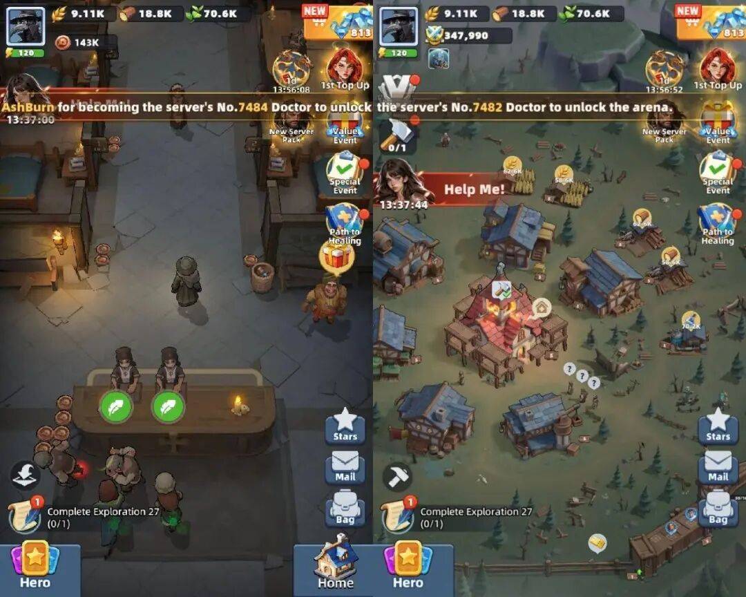 随后,游戏中还会触发英雄遇险等突发事件,推动玩家在限定时间内解锁地块、收集解药、建造新建筑、组建小队、养成英雄,形成紧凑的成长循环。
