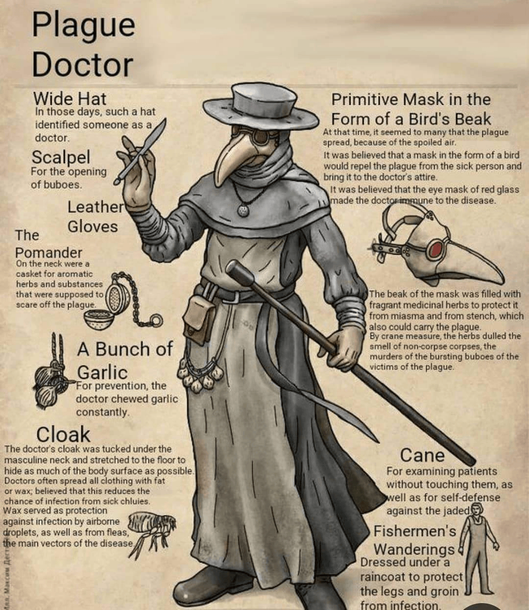 这套防疫造型包括尖嘴面具、蜡布长袍、皮制手套和手持长杖,其中的尖嘴面具内部填充香料与草药,用于在当时 “瘴气理论” 下过滤空气、减少感染风险;连体长袍、皮裤、皮手套、宽檐帽,透明玻璃护目镜,则用以实现物理隔离,隔绝皮肤与病患、污染物接触;长杖主要用来指挥患者、检查身体,减少直接接触风险。
