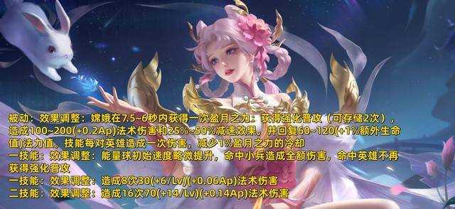 嫦娥削弱:被动改为周期性获得强普,可储存两次,技能对英雄造成伤害会减少被动CD,1技能改为命中后持续造成8段伤害,2技能改为持续造成16段伤害。
