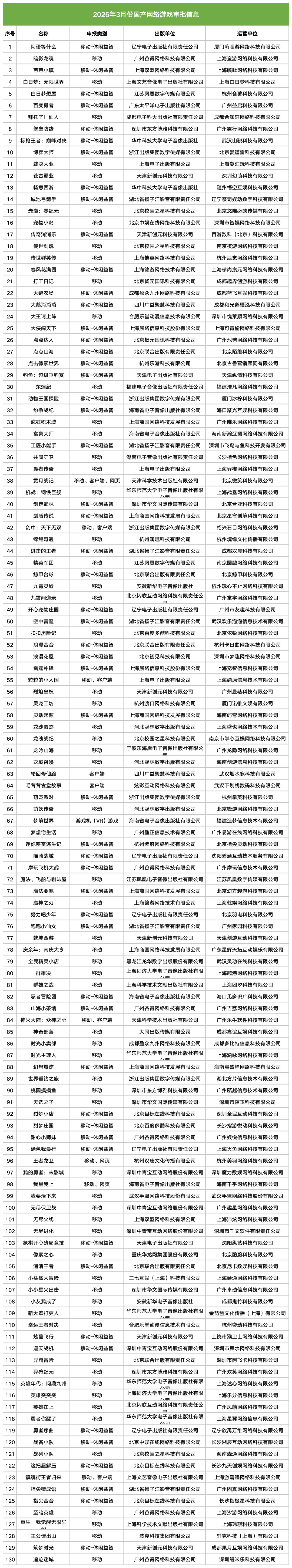 今天,国家新闻出版署公布了3月份国产网络游戏审批信息,共有130款国产游戏以及3款进口游戏获批。