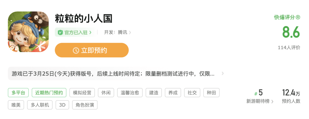 《粒粒的小人国》为腾讯推出的生活模拟类产品,游戏于近期开启了测试,在TapTap、好游快爆等平台累计预约量超过210万。