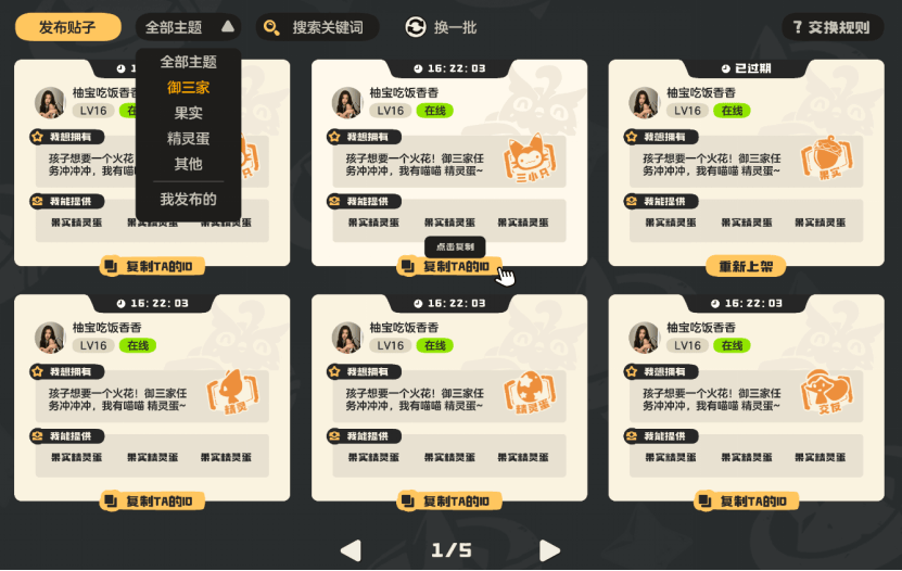 交换大厅则填补了游戏内精灵资源交换的空白,成为玩家之间资源互通的重要平台。在《洛克王国:世界》中,精灵蛋、精灵果实是培养精灵的核心资源,玩家往往会出现“自己有多余的A果实,却急需B果实”“捕捉到重复精灵蛋,想换稀缺品种”的情况,其他渠道下玩家只能靠私下沟通交换,不仅效率低,还存在一定风险。