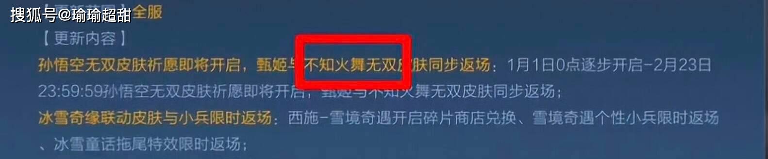 可能很多玩家根本就不知道还有这回事,其实在今年 1 月份的时候,原本定位就是想要返场不知火舞的无双限定皮肤的,当时也是上线孙悟空无双的时候,但后来是临时改成了瑶妹的无双。