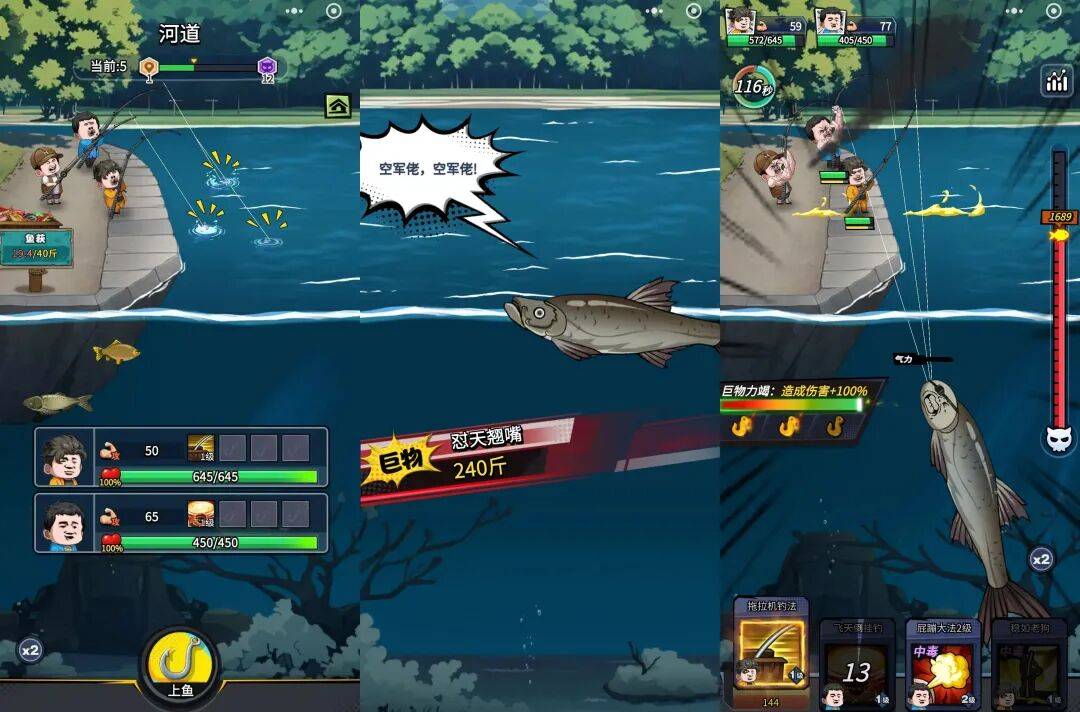 当巨大的鱼Boss顶着一张抽象的表情包脸冲出水面时,配合魔性的音效,玩家的操作反馈被极度放大。