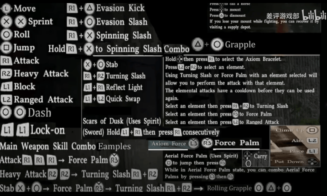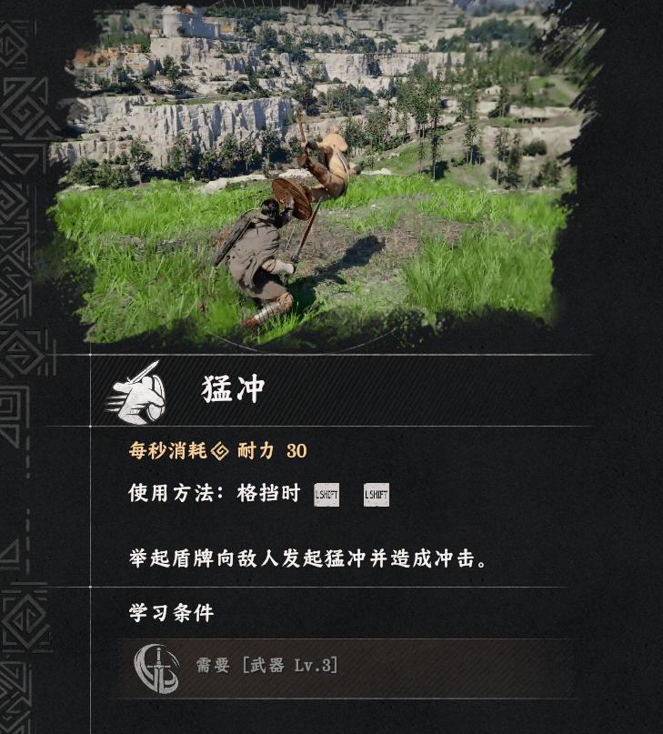游戏共有5种主要武器,每一种都有大量的派生技巧,比如剑盾除了平砍,重击,格挡反击,还有刺击,回旋斩,闪避斩,甚至可以用刀光闪瞎敌人,造成硬直。