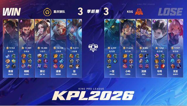KSG的心已经乱了,10分钟非要打主宰,夏侯惇已经残了。钟馗勾到海诺逼出海诺大招,苍在无压力输出,元坦跳进龙坑两个大招直接收下残血夏侯惇和海诺,再顺势拿龙。狼队继续追击,钟馗精准勾到马超,安琪拉完成击杀。这波团打完比赛已经没有任何悬念了。