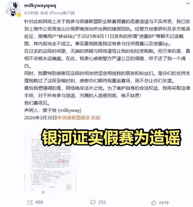 今天咱们来聊聊一桩让无数老玩家拍手称快的“冤案平反”——原FPX、RNG打野milkyway(银河)终于等来了清白。他在个人社交平台晒出了派出所出具的接报回执,正式宣告:我没有假赛,也没有泄露BP!消息一出,评论区直接炸了锅,无数粉丝直呼:正义虽迟但到!