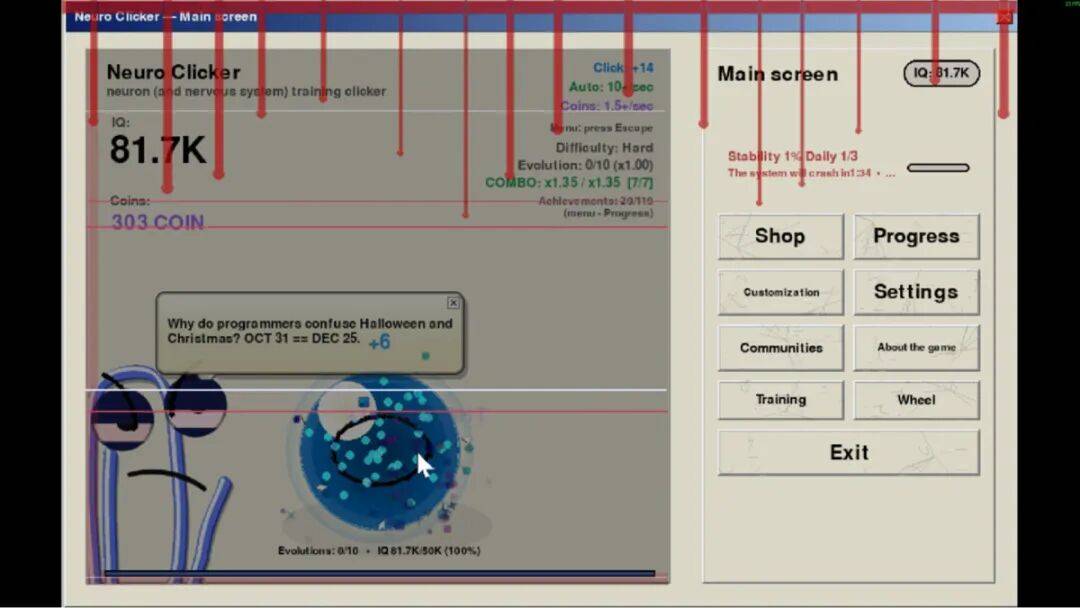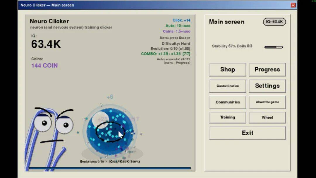 《Neuro Clicker》是一款休闲放置增量游戏,你将在其中培养一个系统神经元,收集 IQ 和金币,解锁强力升级,并应对混乱的小游戏。随着神经元进化,Clippy 会找回失落的记忆碎片,并一步步接近想起她真正是谁。