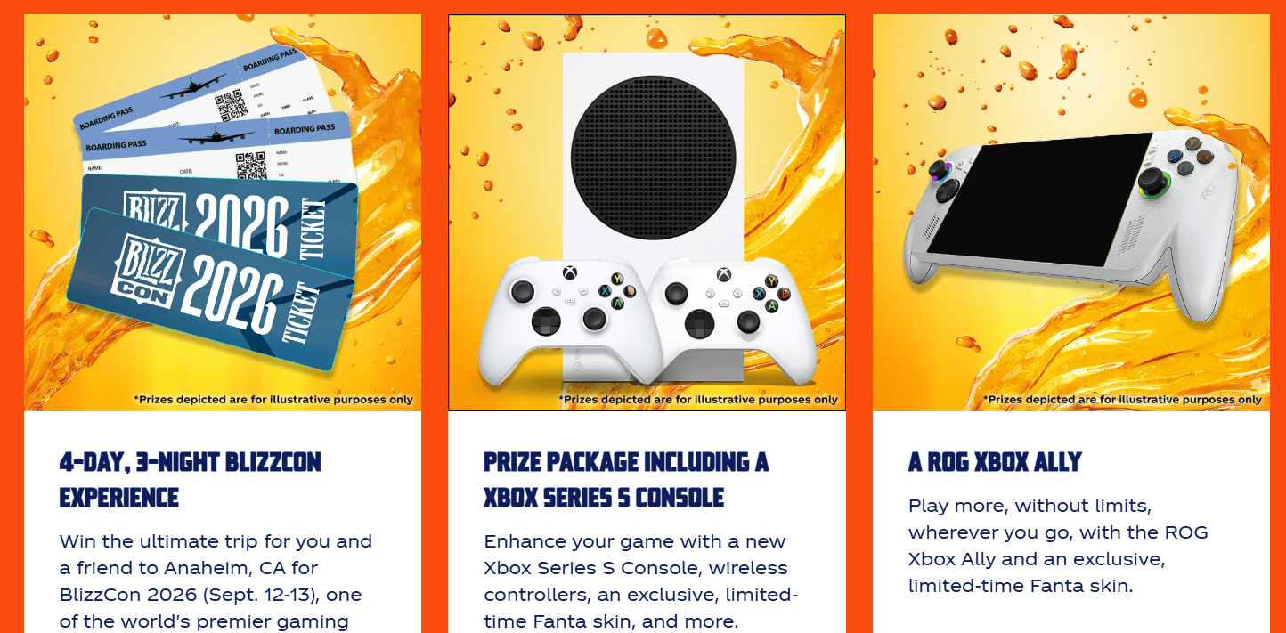本次活动除《魔兽世界》的虚拟奖励外,购买特别版的芬达产品(这些汽水印有Xbox旗下知名游戏的标志角色,如魔兽的萨拉塔斯,暗黑4的圣骑士等),扫描产品上的二维码,即可参与全新Xbox主题挑战活动。完成这些挑战后,粉丝们将有机会赢取丰厚奖品,包括 ROG Ally 掌机(Xbox 版)、Xbox Series S 主机(1TB 版)、Xbox 无线手柄等实物大奖,以及其他奖励。详情请查看芬达官网。