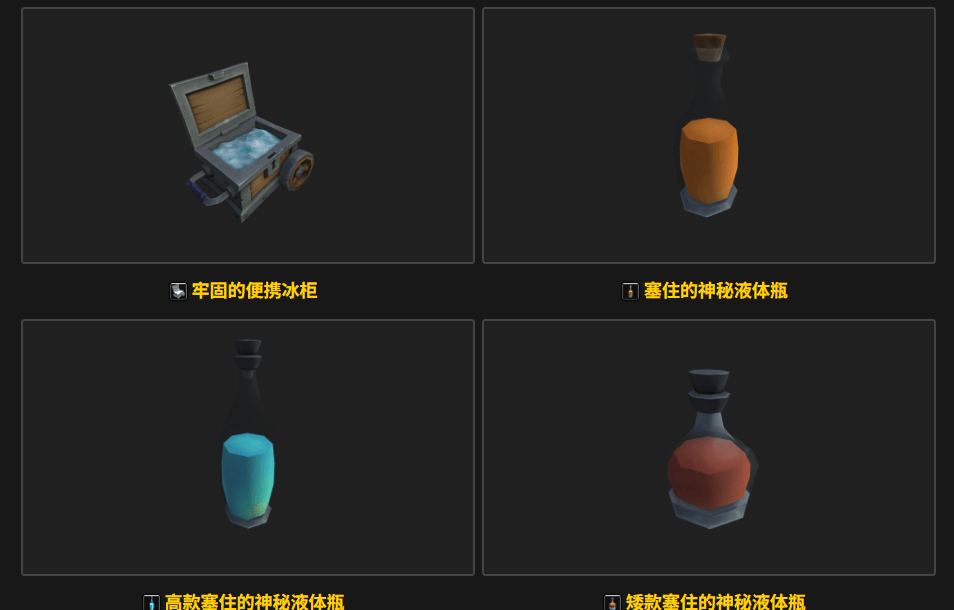 家具和装饰:牢固的便携冰柜、塞住的神秘液体瓶、高款塞住的神秘液体瓶、矮款塞住的神秘液体瓶