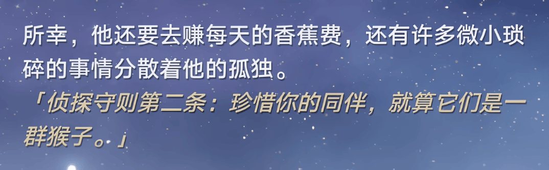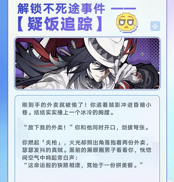 比如说不死途非常缺钱,崩铁有个物料是解锁不死途事件“疑饭追凶”,文案中拼美餐很显然是在玩拼好饭的梗,在了解不死途的故事前会觉得好玩,了解后就是心疼了,他这么努力赚钱却只能吃拼好饭,就是因为他还养着一大家子同伴。