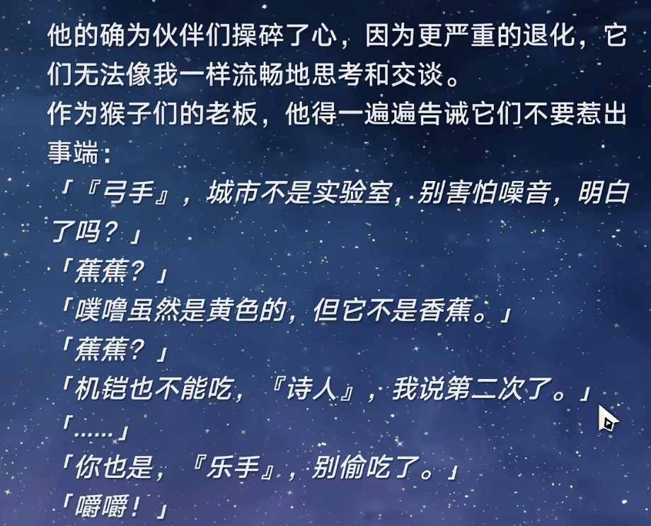 还有跟返祖的同伴交流,文案很轻松,看起来完全就是不死途在跟猴子们交流,但不死途知道这些猴子实际上都是他的同伴,与它们交流时该有多难受?所以前面才会说不死途的性格不够沉稳才是对的,只有保留热忱、真性情的纯粹才能支撑下来。