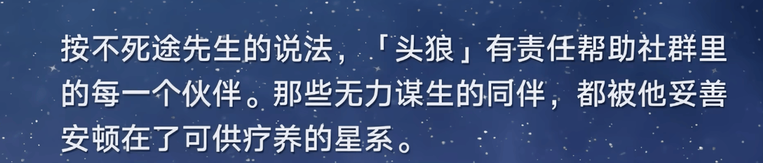 看完这部分内容,不死途作为巡海游侠首领的形象一下就立住了,而且崩铁塑造角色很高明的一点是不可以渲染不死途这些沉重的过往,反而采用诙谐、轻松的文案,让人看了更加心疼不死途。