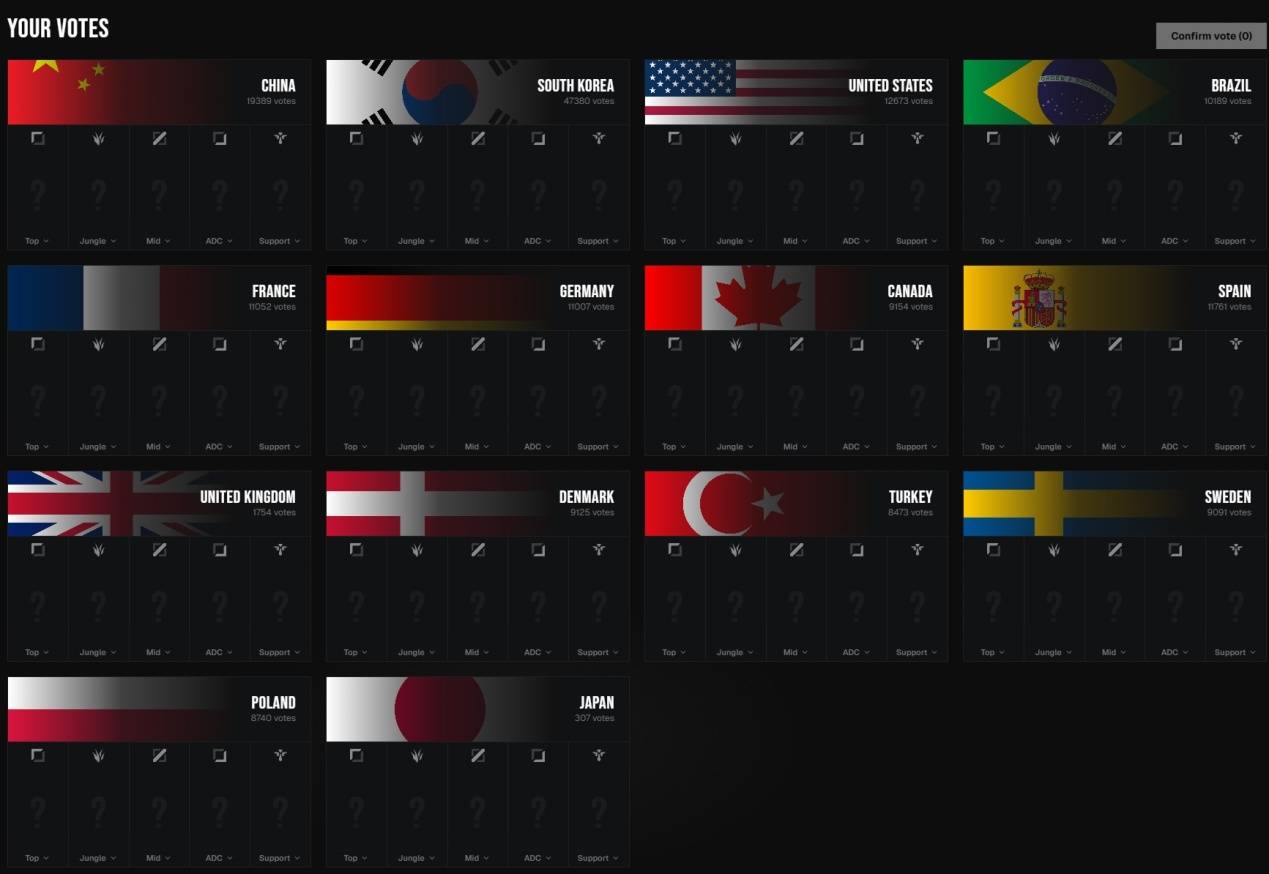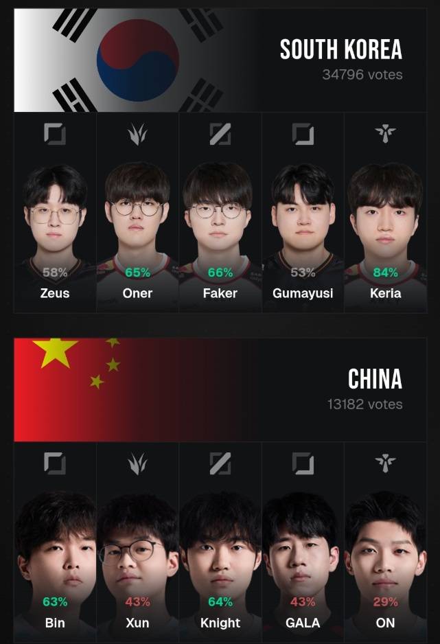 另外国外媒体还发布了一个电竞国家队的投票界面,票选各个国家队大家最希望看到的阵容,有趣的是韩国队这边大家选出来的是ZOFGK,也就是T1战队之前的冠军阵容,Zeus和Gumayusi如今已经离队。
