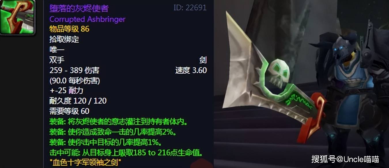 基尔加丹掉落的AB大剑,是TBC版本物理职业的巅峰之作。三红色插槽搭配完美的爆击、急速属性,让它成为惩戒骑、战士甚至猎人的终极追求。当年拿着AB大剑的惩戒骑,畸形版本滚键盘时期堪称“移动炮台”,暴力美学被它诠释到了极致。