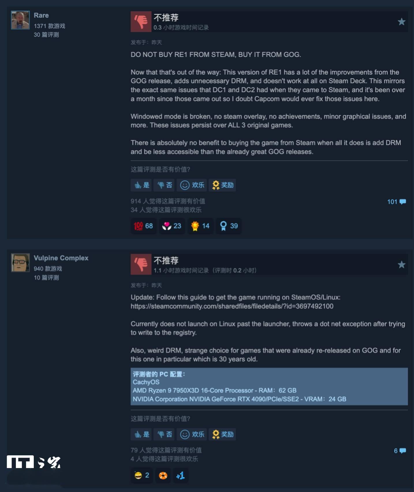 IT之家 4 月 3 日消息,卡普空昨天在 Steam 平台上架了《生化危机》初代 / 二代 / 三代游戏,然而玩家发现这三款作品均捆绑了备受诟病的 Enigma DRM 加密技术,引发玩家批评声浪。