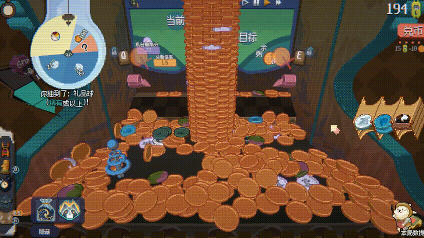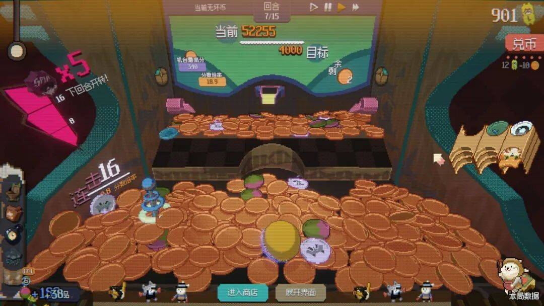 《浣熊推币机》最直接的魅力,也来自于此。抛开数量庞大的特殊代币、芯片、道具和肉鸽构筑,它的核心玩法其实非常简单:投币,推动机台,赢得更多代币,进而达到回合所需的分数通关。