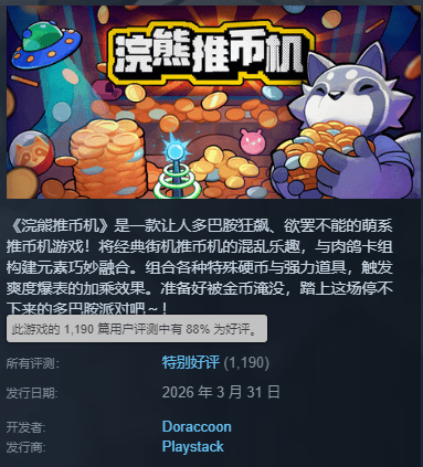 这次拜访结束后不久,3月31日,肉鸽策略游戏《浣熊推币机》正式发售。发售24小时内,游戏便突破了10万份销量,截至目前,Steam评价仍维持在“特别好评”,且评价数还在高速增长。