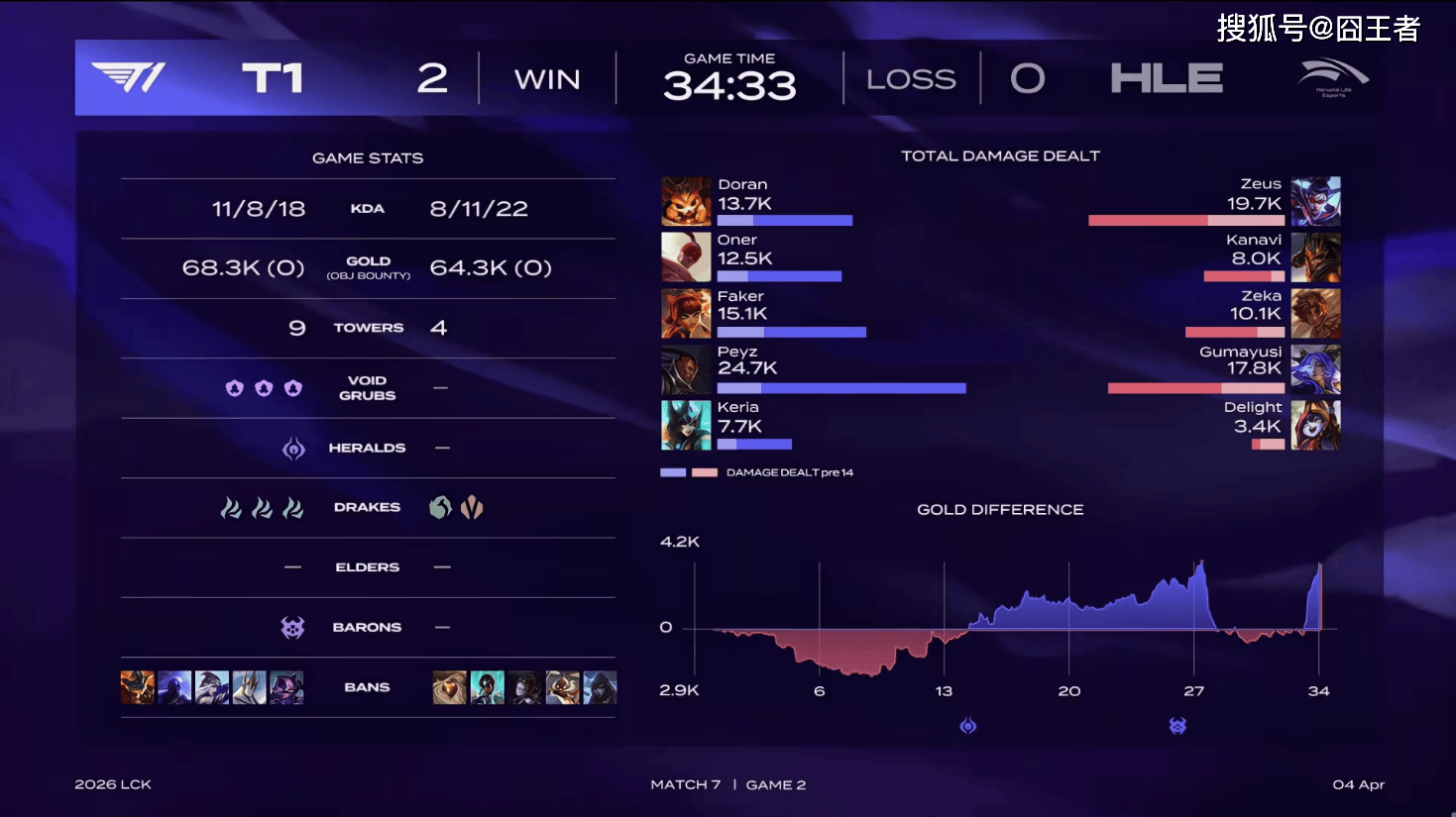 坦率的讲,第二局比赛,我都不知道怎么复盘,比赛前期HLE一度打出4-0的开局,被以为他们稳了,能扳回一局,结果Oner的盲僧,迅速帮助T1迅速打回局面,Peyz卢锡安成功线杀Gumayusi;比赛第27分钟,T1抱团拿下大龙;比赛第28分钟,Doran纳尔落单被秒,Zeus薇恩双杀HLE一波打出0换3;最终比赛第34分33秒,Oner盲僧三杀帮助T1一波打出0换4结束比赛,这你敢信?