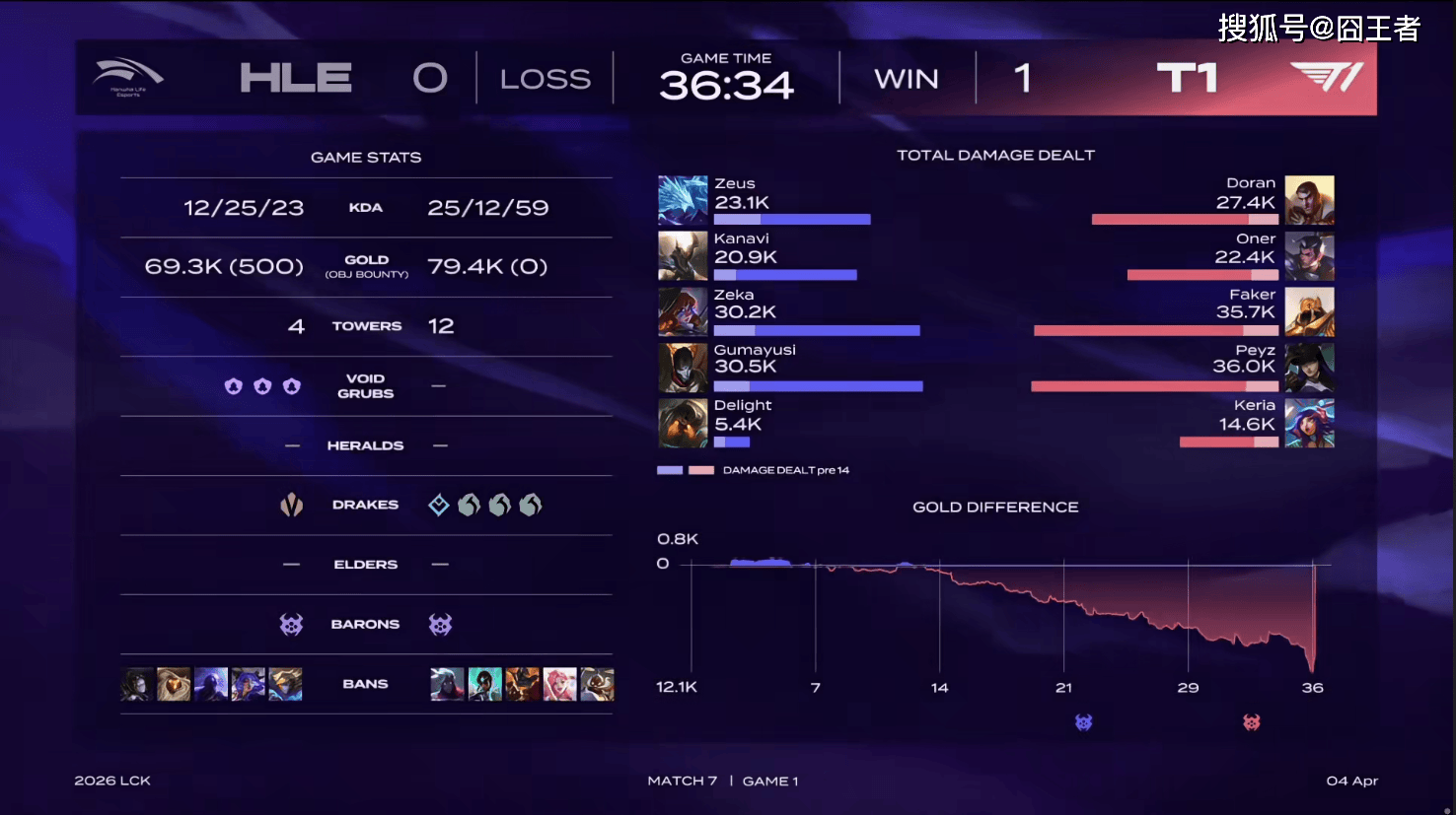 结果第一局比赛,被T1找回状态,打出了碾压局。比赛第 15分钟,HLE野辅连续两次阵亡,T1打出0换2后前期拉开四千经济差;比赛第 23分钟,Zeka阿萝拉落单被秒,T1抱团打大龙先后0换3但Kanavi潘森抢到大龙;比赛第 26分钟,T1乱战先后打出0换3后拉开经济差;比赛第 28分钟,Faker沙皇拉扯单杀Kanavi潘森,T1一波打出2换4大胜;最终比赛第 36分34秒,Doran杰斯四杀一波结束比赛。