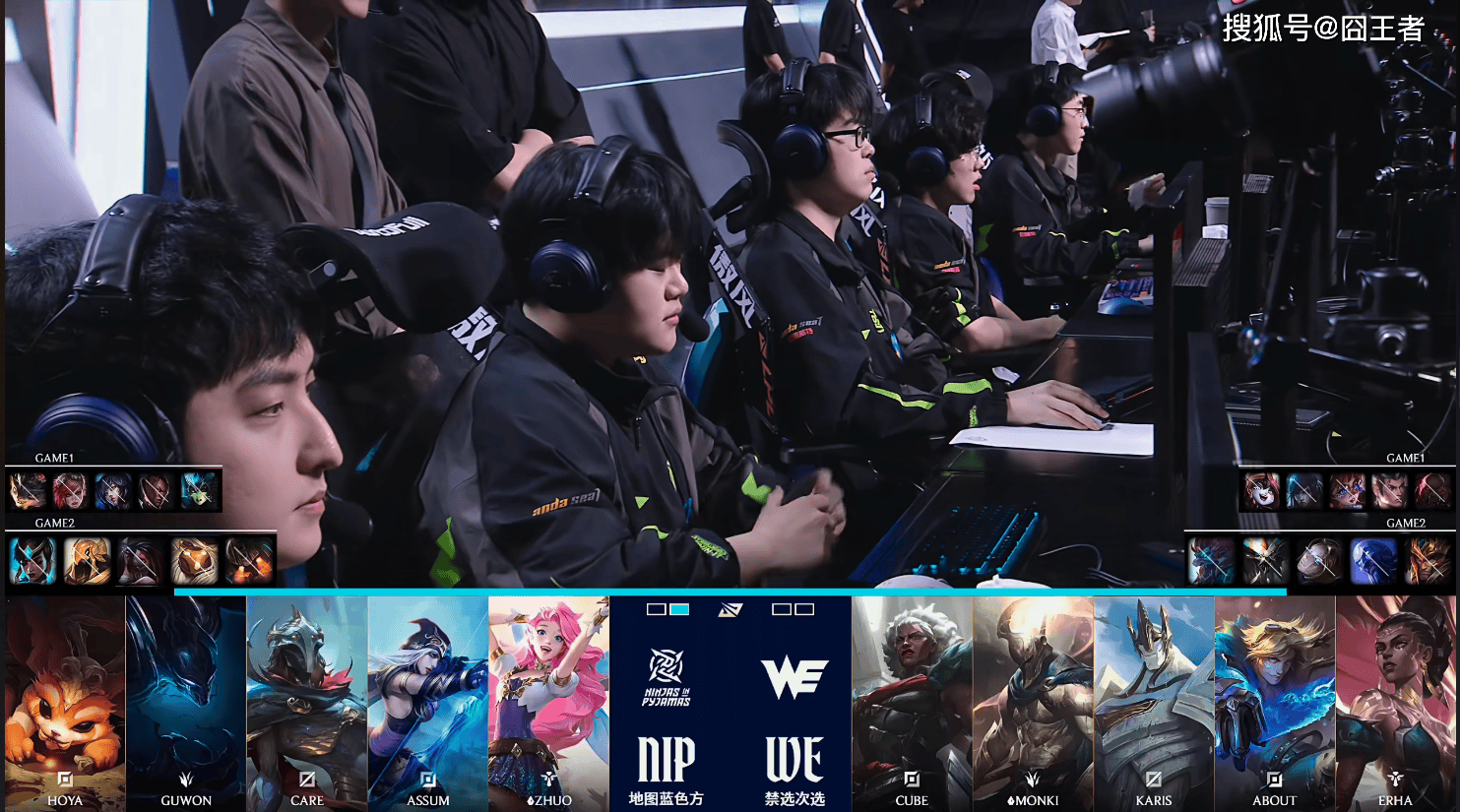 第二局比赛,NIP蓝色方,禁用:扇子妈、沙皇、阿卡丽、巴德、泰坦,选用:Hoya纳尔、Guwon梦魇、Care维克托、Assum寒冰、Zhuo女明星;WE红色方,禁用:皇子、瑞兹、发条、蝎子、巨魔,选用:Cube狼母、Monki潘森、Karis加里奥、About EZ、Erha梅尔
