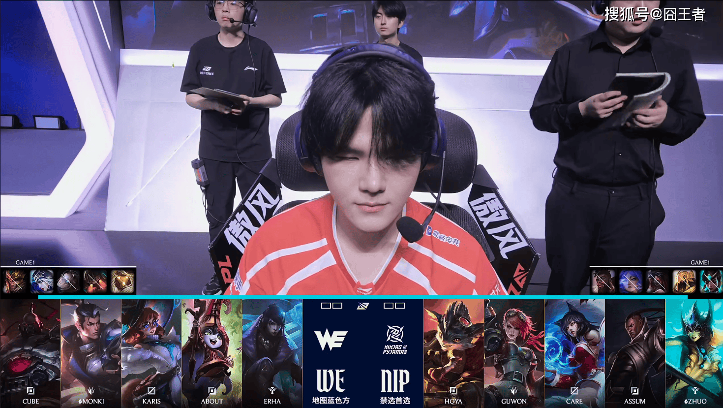第一局比赛,WE蓝色方,禁用:皇子、寒冰、发条、泰坦、巴德,选用:Cube塞恩、Monki赵信、Karis兔子、About月男、Erha露露;NIP红色方,禁用:扇子妈、沙皇、阿卡丽、芸阿娜、奎桑提,选用:Hoya兰博、Guwon蔚、Care狐狸、Assum卢锡安、Zhuo娜美