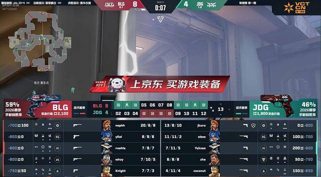 下半场的前两分被BLG拿下,第十五回合,nepph双杀帮队伍拿到优势后顺利拿下这一分,比分差距已经来到了七分,JDG叫出第二个暂停。